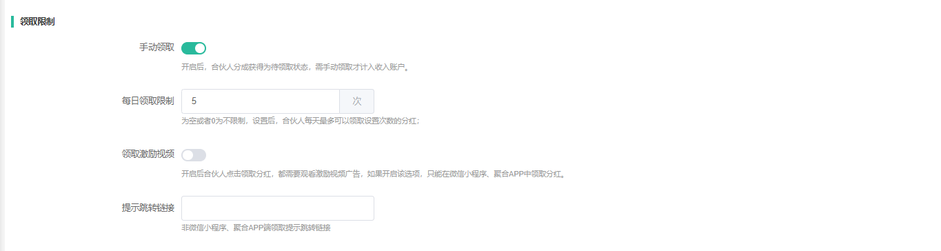 1、 开启手动领取则需要会员去前端手动点击领取分成才会计入收入,不开启则产生分成时自动计入会员收入