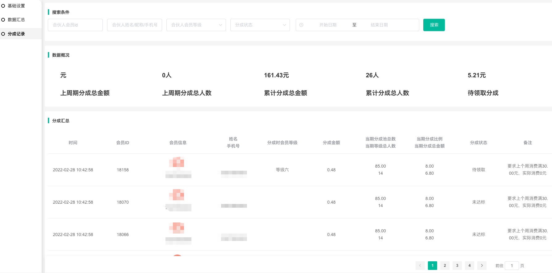 4、累计分成金额:会员累计分成金额(包含未达标、待领取、已分成)