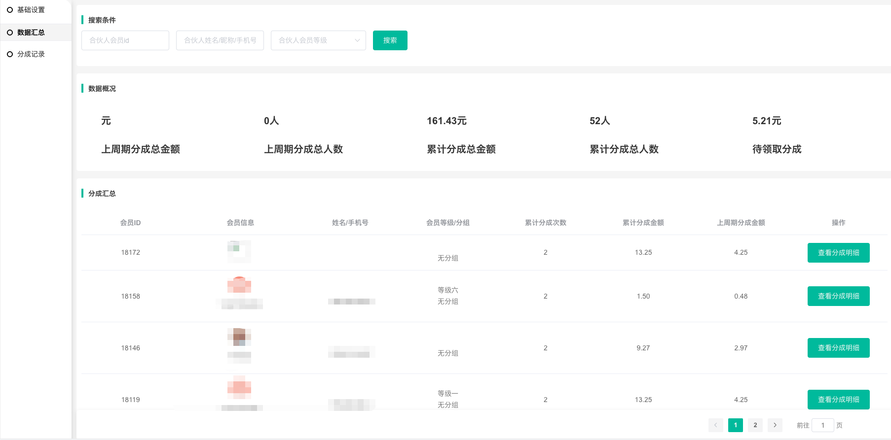 2、 记录页面显示会员信息、分成时会员等级、分成金额、当期分成池总数、当期分成池总人数、分成比例、分成总金额