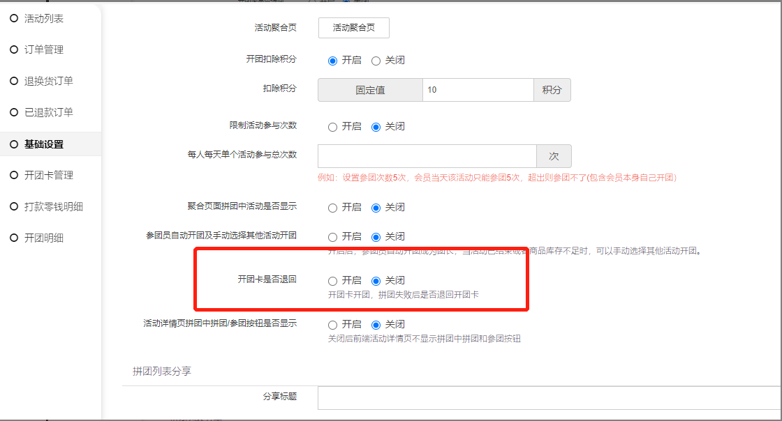 5, 开团卡是否退回:开启后拼团失败退回开团卡