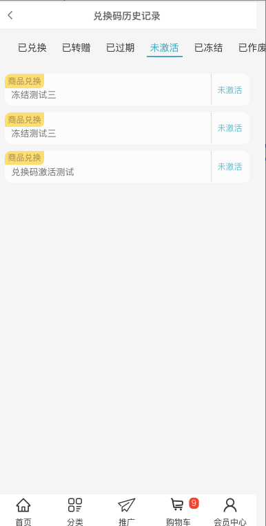 历史记录列表增加未激活、已冻结、已作废记录显示,未激活的也属于已冻结状态,所以未激活的兑换码会同时在两个列表显示