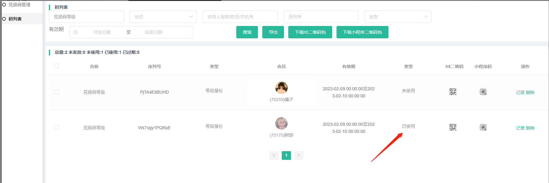 兑换码:显示该兑换码详情数据,点击会跳转到码列表页面(页面展示名称,序列号,类型,会员,有效期,状态,H5二维码,小程序码,操作(记录,删除)