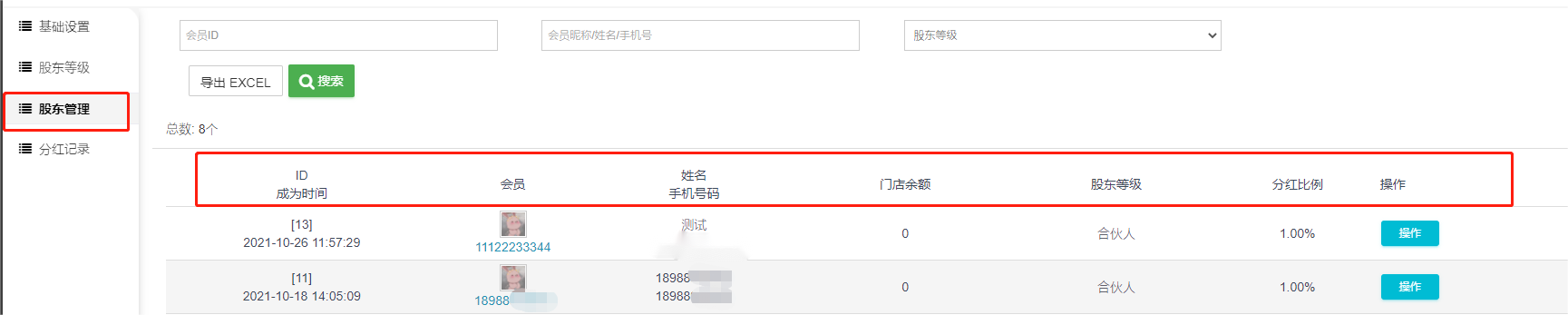 ③在该列表可查看到股东的id、成为时间、股东会员信息、股东等级、分红比例