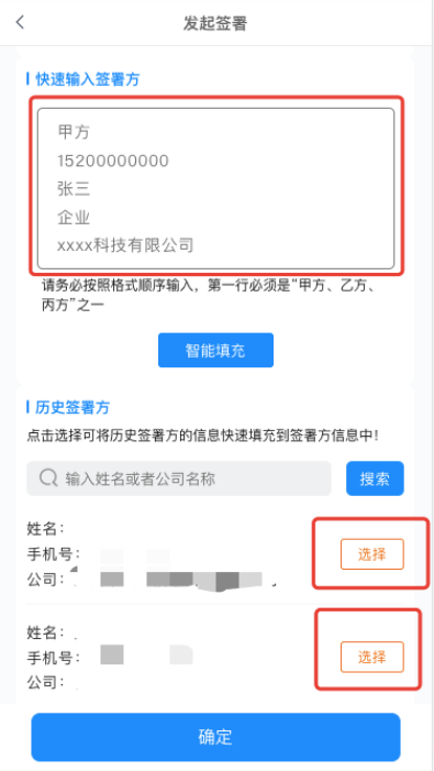 *签署角色的添加除了手动填写,还有智能填充、选择历史签署方两种方式,快速填写签署方信息,操作更简单便捷。