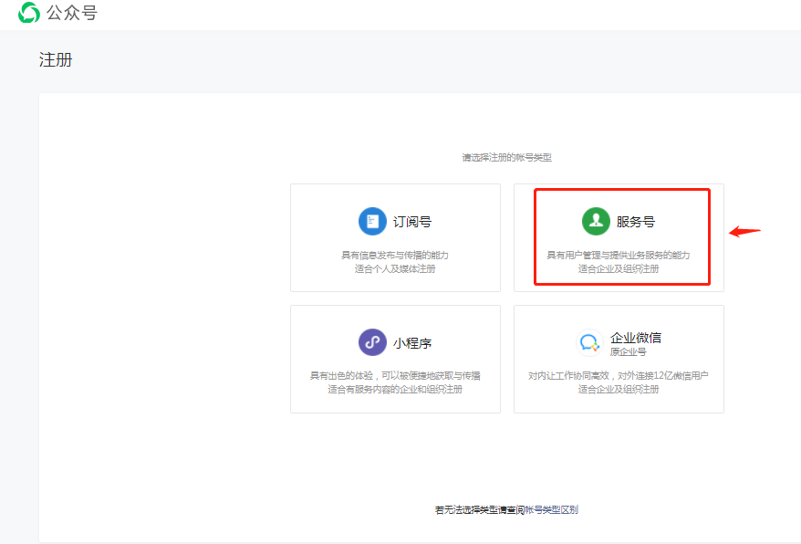 1、进入官网后,点击“立即注册”,进入类型选择页面,选择“服务号”