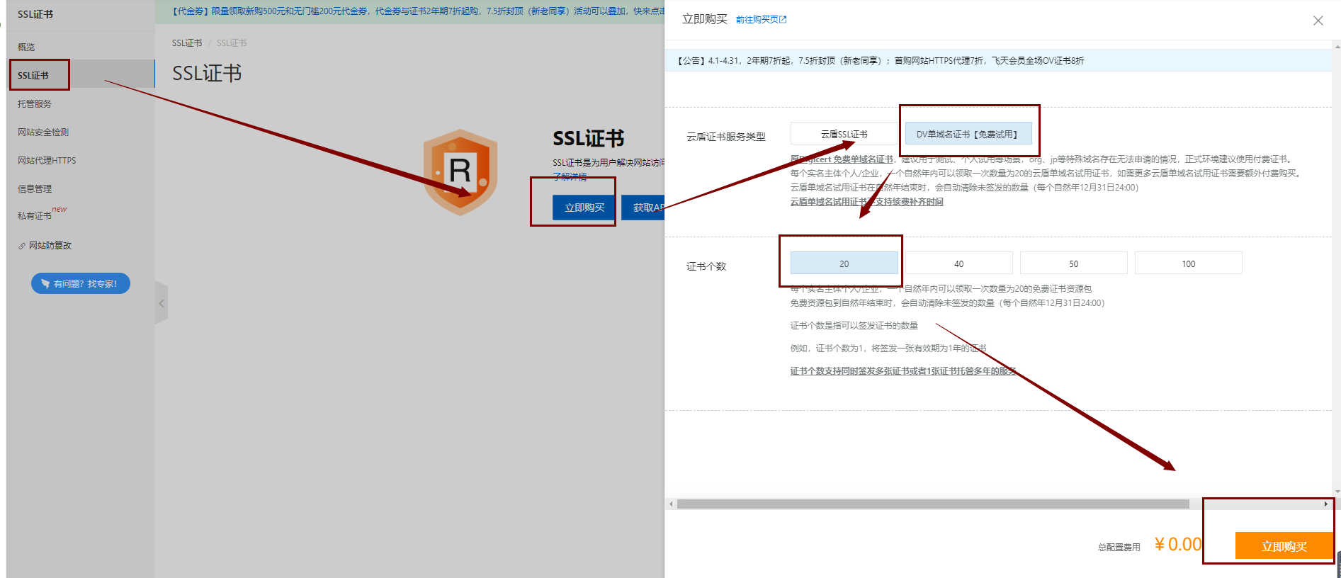 2、SSL证书控制台-SSL证书资源包-立即购买,按截图选择免费证书
