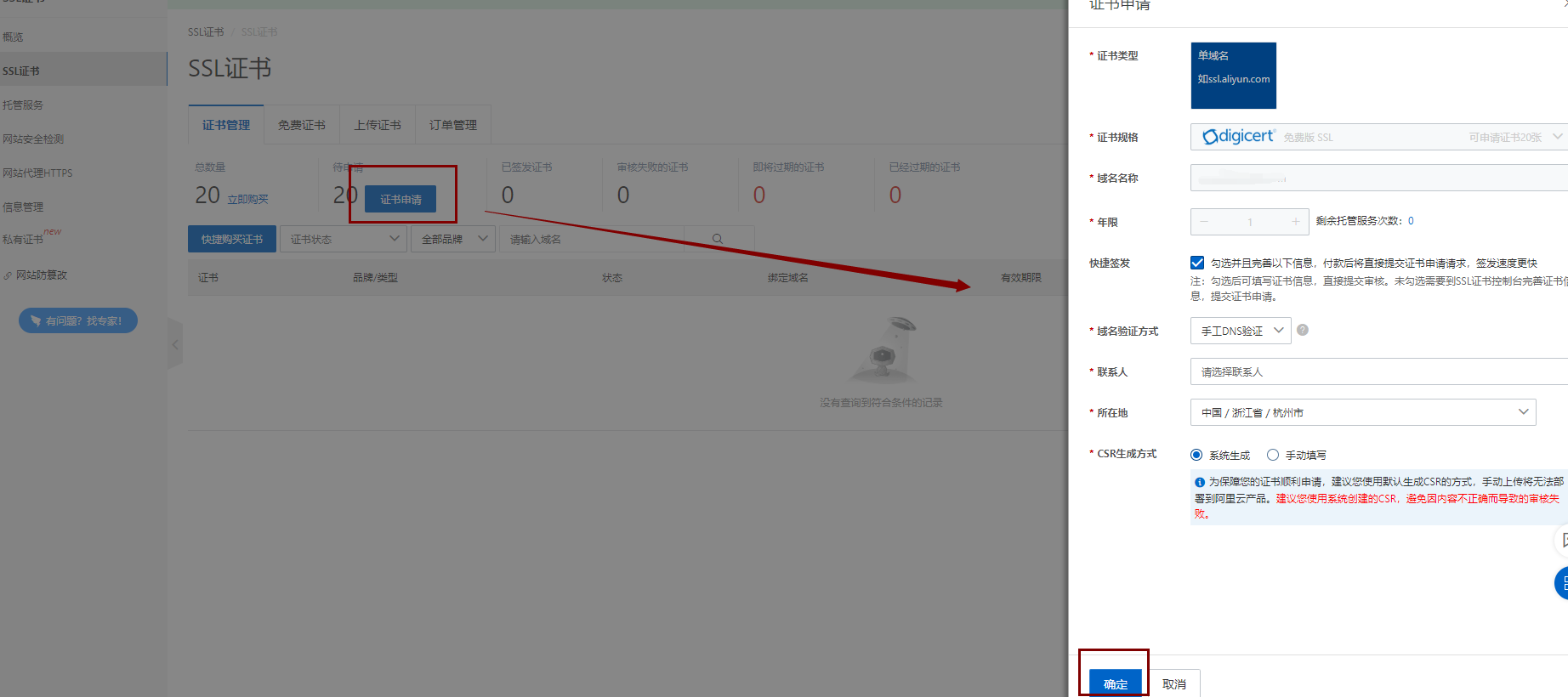 4、返回SSL证书,找到购买的证书,点击证书申请