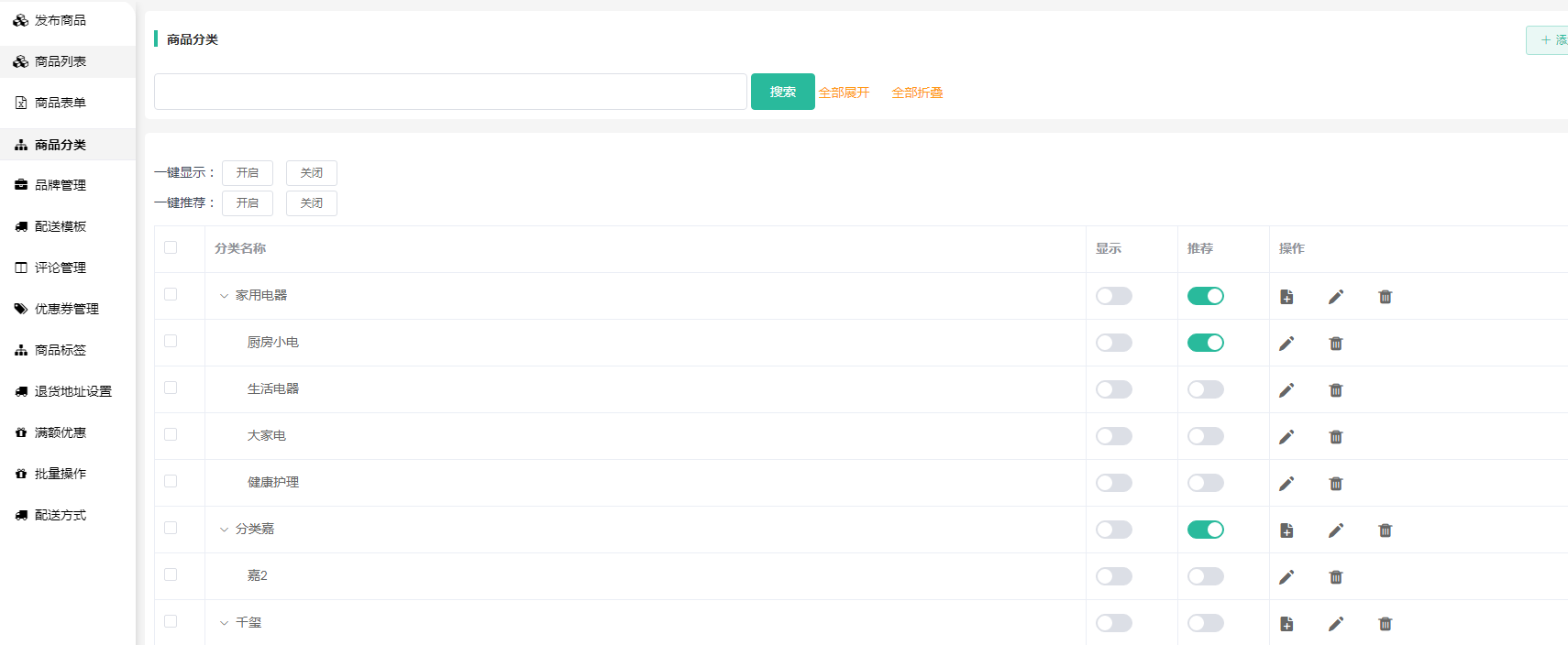 商品支持二级、三级商品分类,需在系统-商城设置-分类中选择分类级别;
